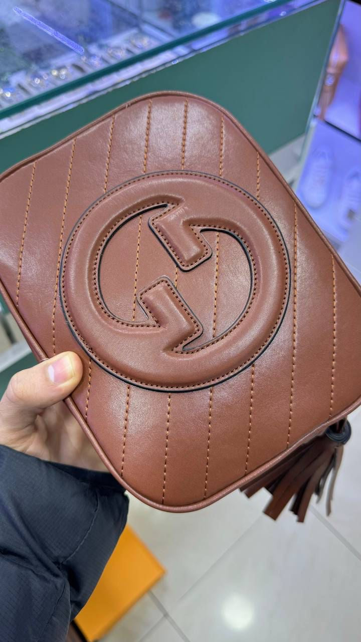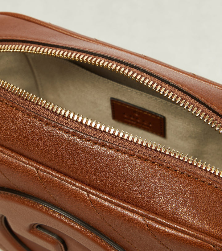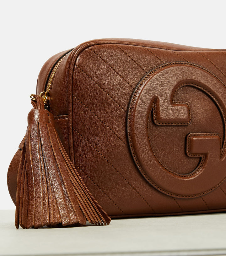 Gucci a puisé dans ses archives pour créer l'écusson Interlocking G qui orne le sac Gucci Blondie Small. Ce modèle compact est fabriqué en Italie en cuir lisse marron et est doté de pampilles latérales et d'une bandoulière réglable.