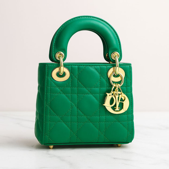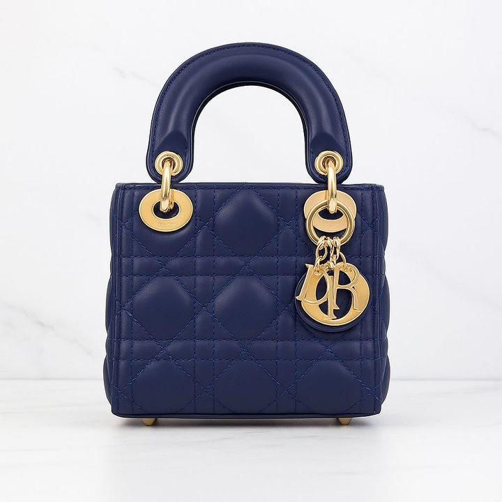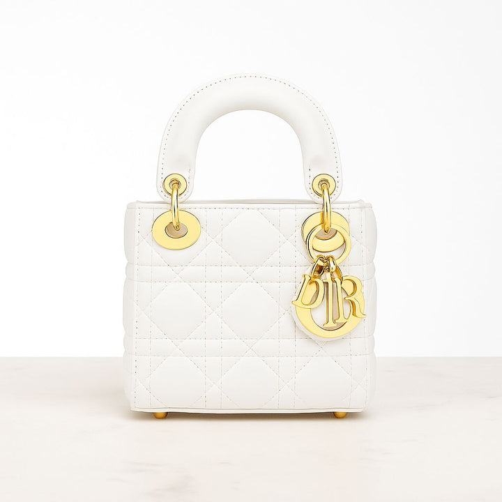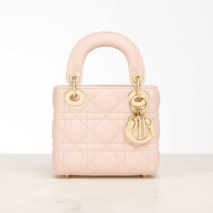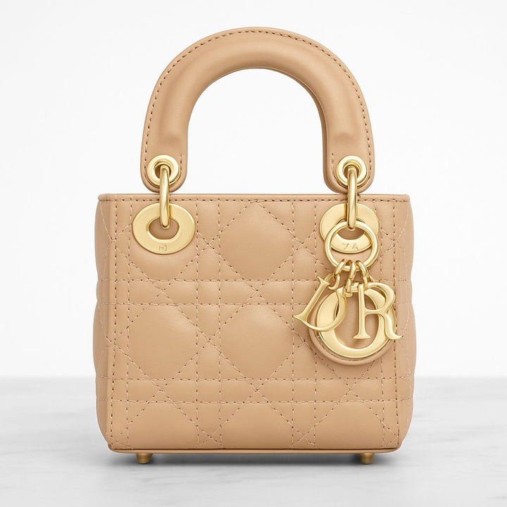 Sac Lady Dior orné de la couture cannage emblématique et de charms métalliques dorés.