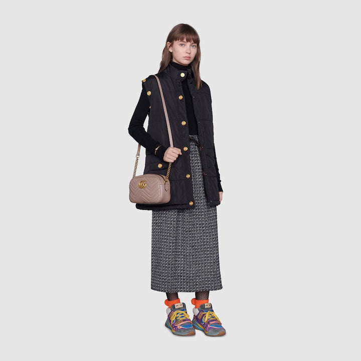 Inspirée par l’ambiance estivale et les clubs de plage du littoral italien, cette pièce est issue de la collection Gucci Lido. Le sac à épaule GG Marmont de petite taille avec chaîne arbore une silhouette légèrement structurée et une fermeture zippée sur le dessus ornée du détail Double G. Sa bandoulière chaîne est ornée d'un détail en semi cuir sur l'épaule. Confectionné en cuir matelassé avec motif chevron et GG à l'arrière.