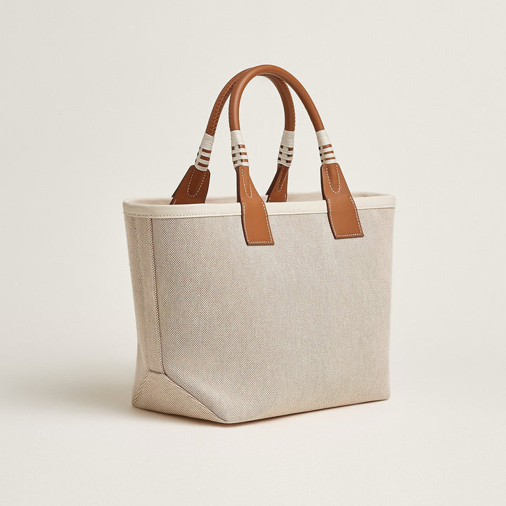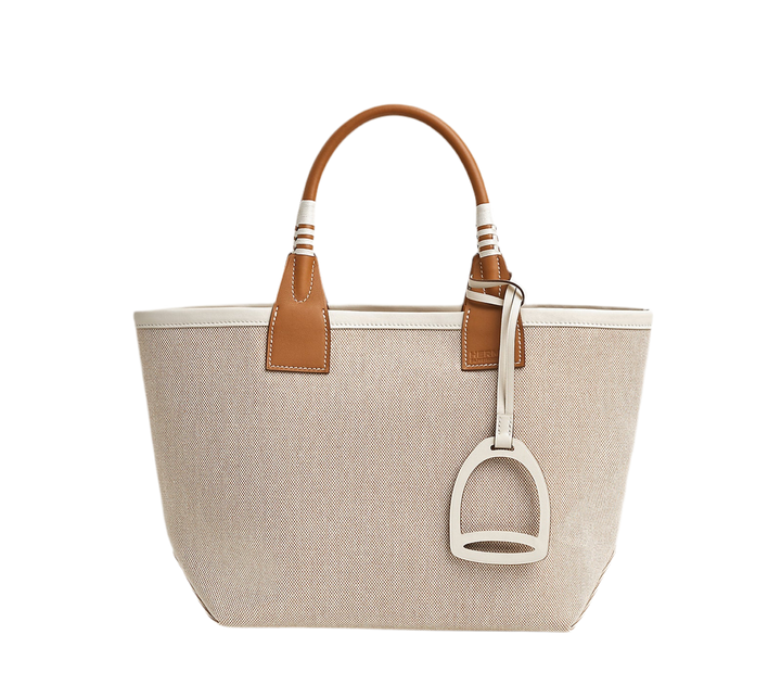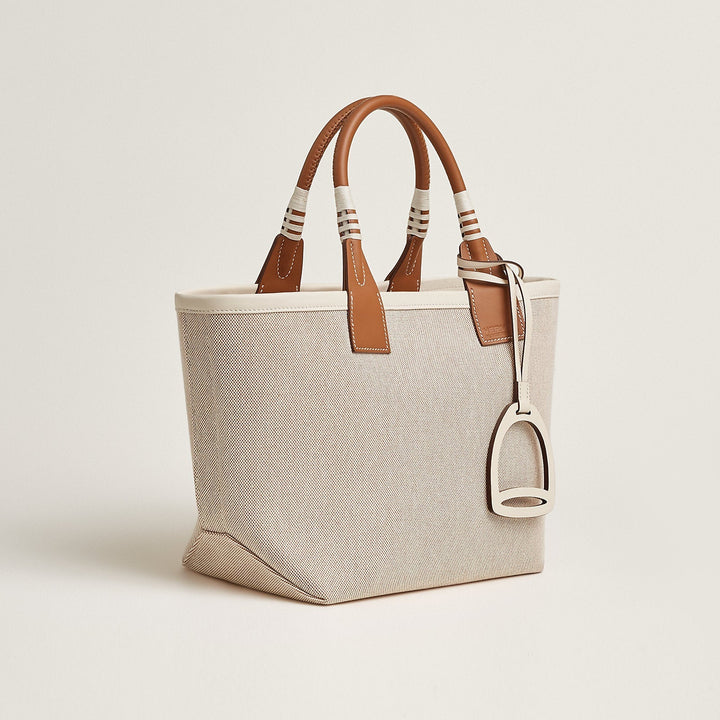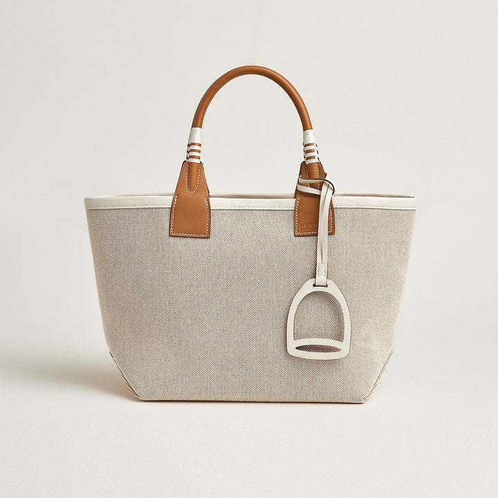Sac en toile H et veau Swift, fond amovible en toile, grande poche plate arrière intérieure, dé d'attache, poignées inspirées de la cravache du cavalier, grigri en forme d'étrier