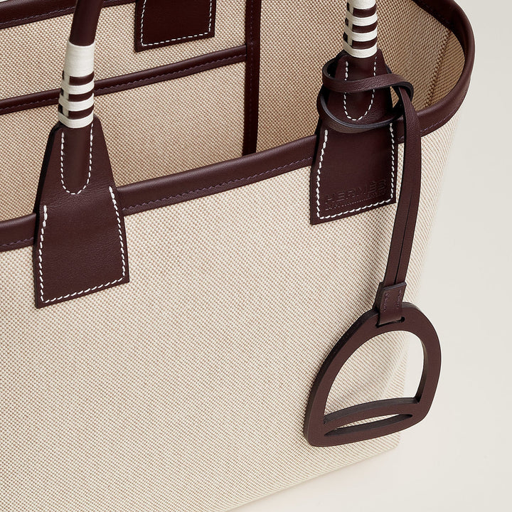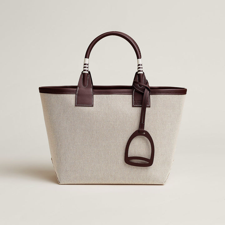 Sac en toile H et veau Swift, fond amovible en toile, grande poche plate arrière intérieure, dé d'attache, poignées inspirées de la cravache du cavalier, grigri en forme d'étrier