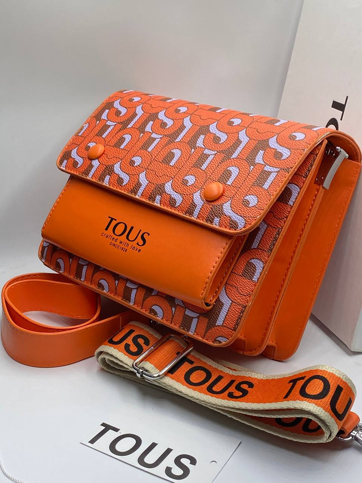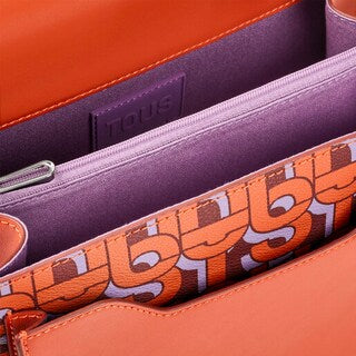 Sac bandoulière TOUS MANIFESTO Audree de taille moyenne en toile avec bordure en cuir synthétique et imprimé orange. Deux fermetures à bouton magnétique. Poche extérieure ouverte. Il comporte deux compartiments intérieurs séparés par une poche zippée. Bandoulière fixe et bandoulière réglable et amovible. Dimensions (hauteur x largeur x profondeur) : 20 x 25 x 12 cm.